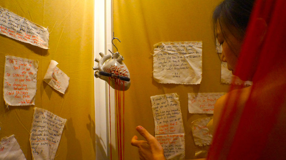 The Raped Love by Indonesian artist Nia Gautama is a performance and installation inspired by stories of strong women who had experienced emotional pain and trauma because of men. During her performances, Nia interviewed women and listened to their stories ridden with domestic violence, infidelity and abandonment. Stories she had collected ranged from women being abandoned because of extra-marital pregnancies to women who experienced sexual harassment and verbal abuse in the hands of men they loved and trusted. Her installation recorded the collective memories of the female participants to tell a powerful story of female resilience in the Indonesian society.